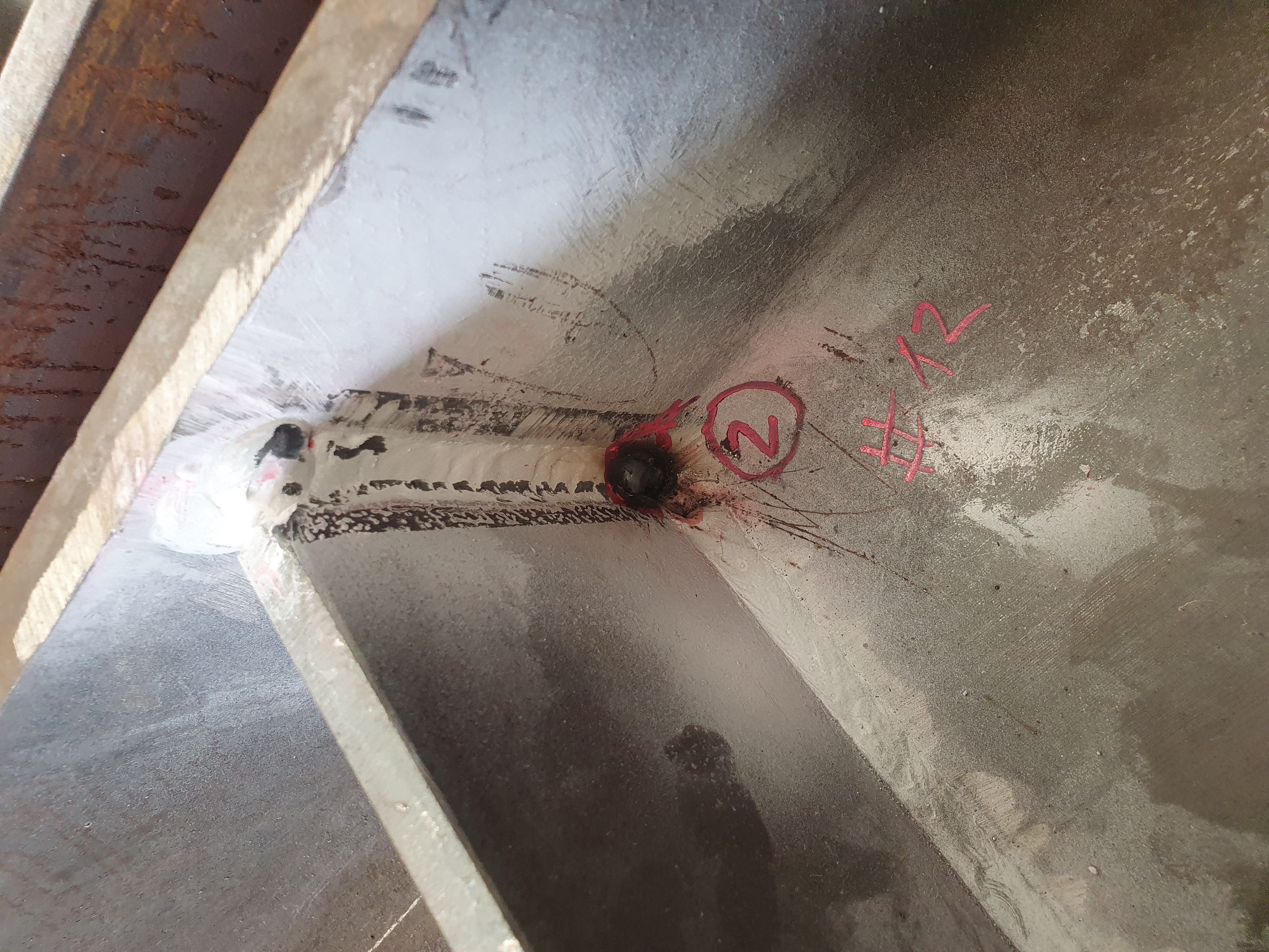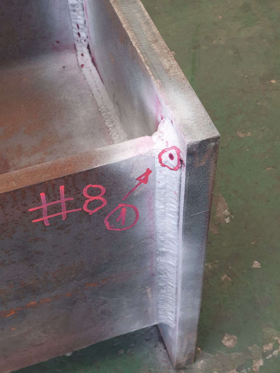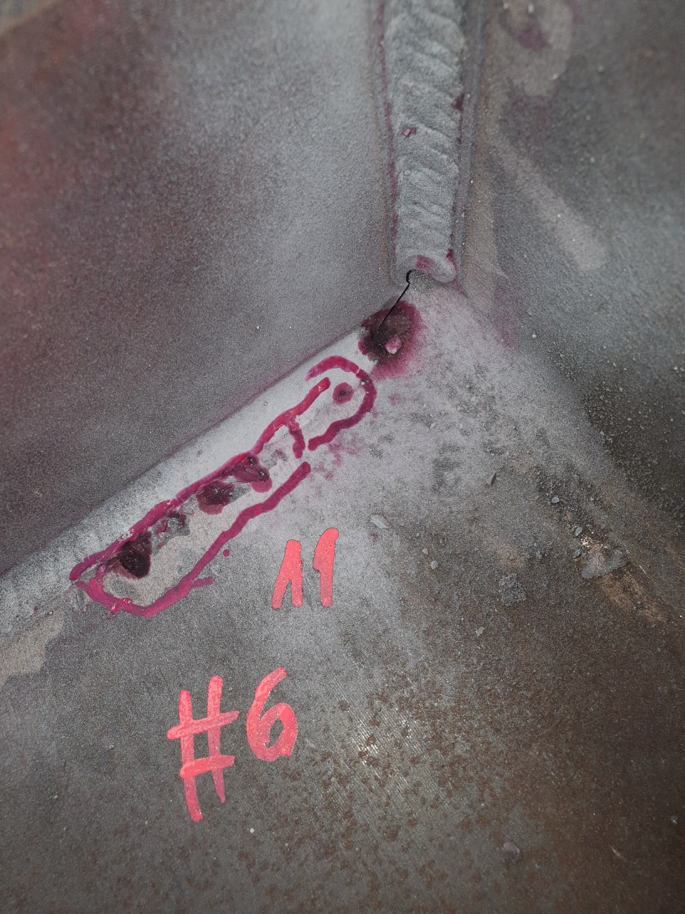 Detección de discontinuidades abiertas a la superficie, como fisuras, porosidades, falta de fusión, utilizando Líquidos Penetrantes visibles.